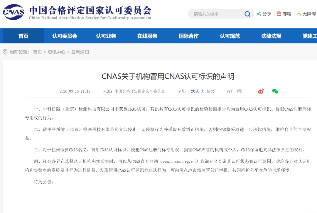 3 月 16 日,中国合格评定国家认可委员会(CNAS)官网发布重磅声明,直接点名某(北京)检测科技有限公司存在冒用 CNAS 认可标识的严重违规行为 —— 未获 CNAS 认可却出具带 CNAS 标识的检验检测报告,侵犯 CNAS 注册商标专用权。CNAS 明确要求其立即停止侵权,否则将采取法律措施。这一 “亮剑式” 通报,给所有检测机构敲响警钟:CNAS 标识绝非可随意使用的 “宣传标签”,未获证使用就是触碰行业 “致命红线”。